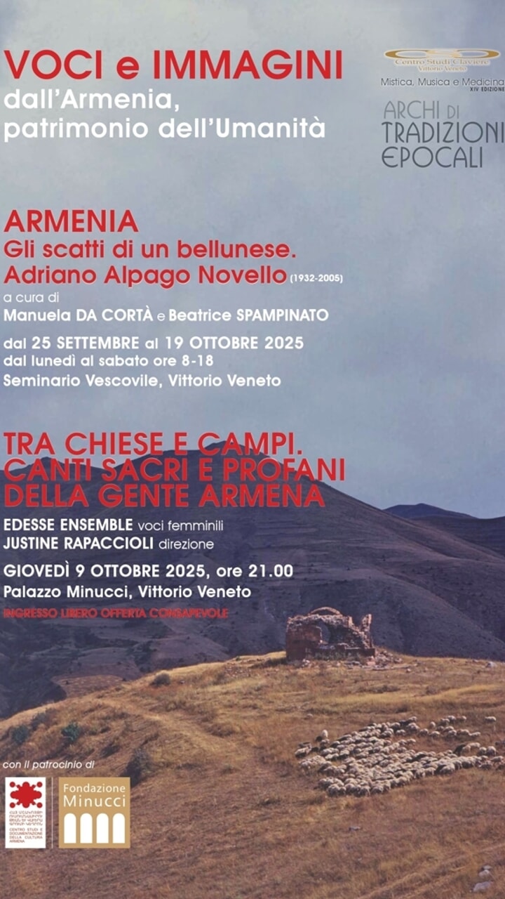Il percorso origina dunque da lontano, precisamente dall’Armenia, cui è dedicata una specifica sezione, “Voci e immagini dall’Armenia, patrimonio dell’Umanità”. Dal 25 settembre al 19 ottobre sarà infatti visitabile presso il Seminario Vescovile, orario consueto di apertura, la Mostra fotografica Armenia. Gli scatti di un bellunese. Adriano Alpago Novello (1932‑2005), curatrici Manuela Da Cortà e Beatrice Spampinato: un saggio dell’estesa ricerca che l’architetto Alpago Novello condusse in terra armena sugli spazi sacri caratteristici di quei luoghi ma così vicini alla nostra sensibilità.