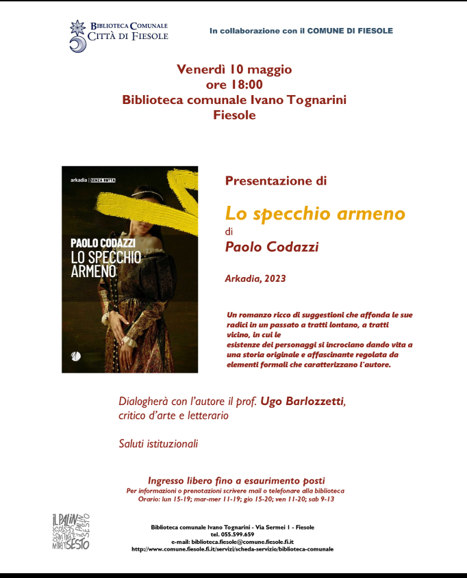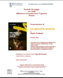 Venerdì 10 maggio 2024, alle ore 18, presso la ‘Biblioteca comunale Ivano Tognarini’ di Fiesole (via Sermei 1), verrà presentato il romanzo di Paolo Codazzi ‘Lo specchio armeno’, edito da Arkadia. Dopo i saluti istituzionali, dialogherà con l’autore il Prof. Ugo Barlozzetti, critico d’arte e letterario. ‘Lo specchio armeno’ è un romanzo ricco di suggestioni, che affonda le sue radici in un passato a tratti lontano, a tratti vicino, in cui le esistenze dei personaggi narrati si incrociano dando vita a una storia originale e affascinante.