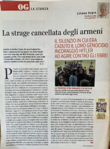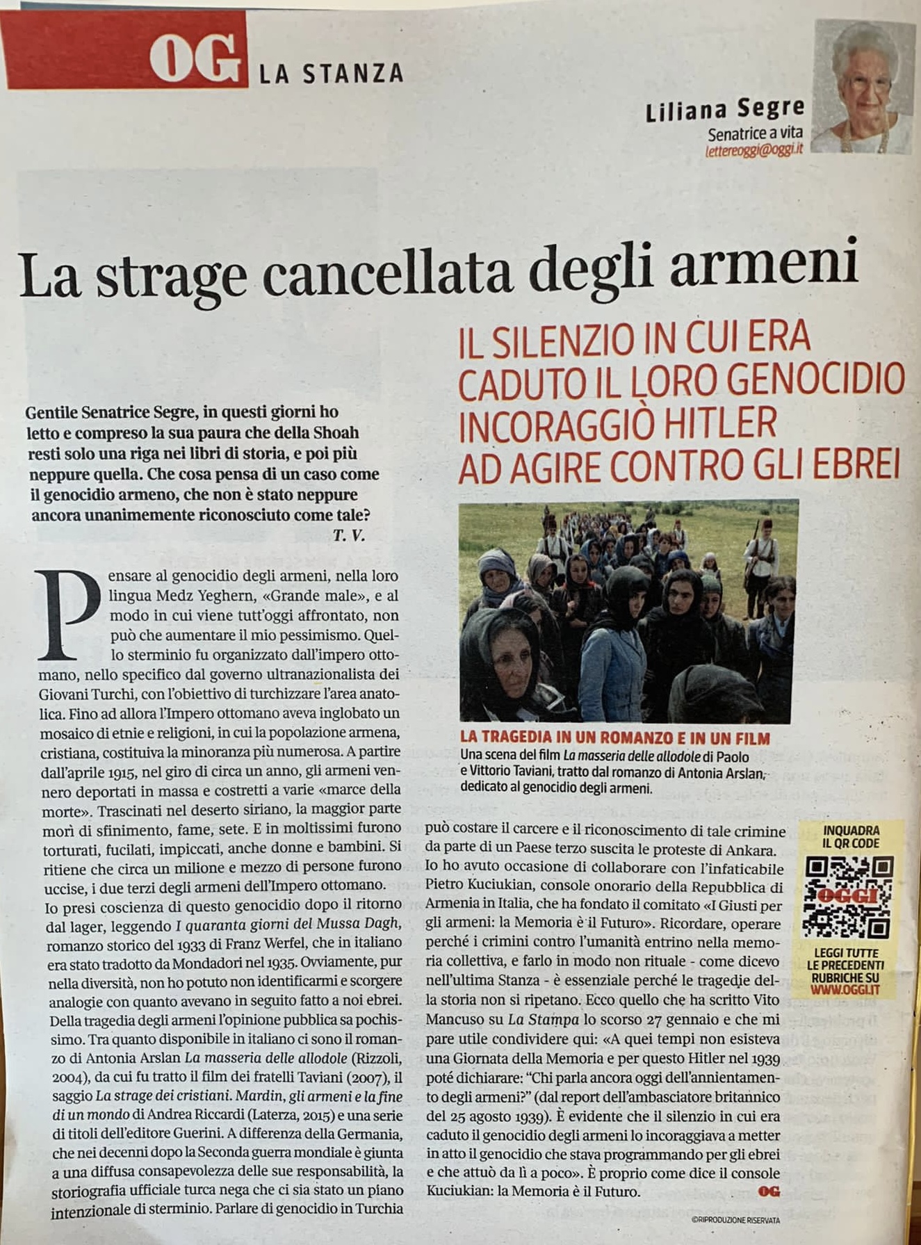 La strage cancellata degli armeni (Oggi 01.02.23) 1 Febbraio 2023/in Rassegna Stampa /da adminwpUn bell’articolo della Senatrice Liliana Segre sul settimanale “Oggi “ di questa settimana nella rubrica “La Stanza” http://www.comunitaarmena.it/wp-content/uploads/2022/08/Logo_armenia-04-1-300x92.png 0 0 adminwp http://www.comunitaarmena.it/wp-content/uploads/2022/08/Logo_armenia-04-1-300x92.png adminwp2023-02-01 19:11:012023-02-02 19:12:48La strage cancellata degli armeni (Oggi 01.02.23)
