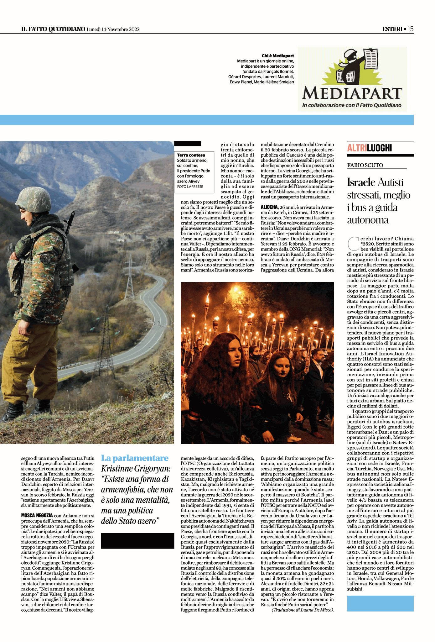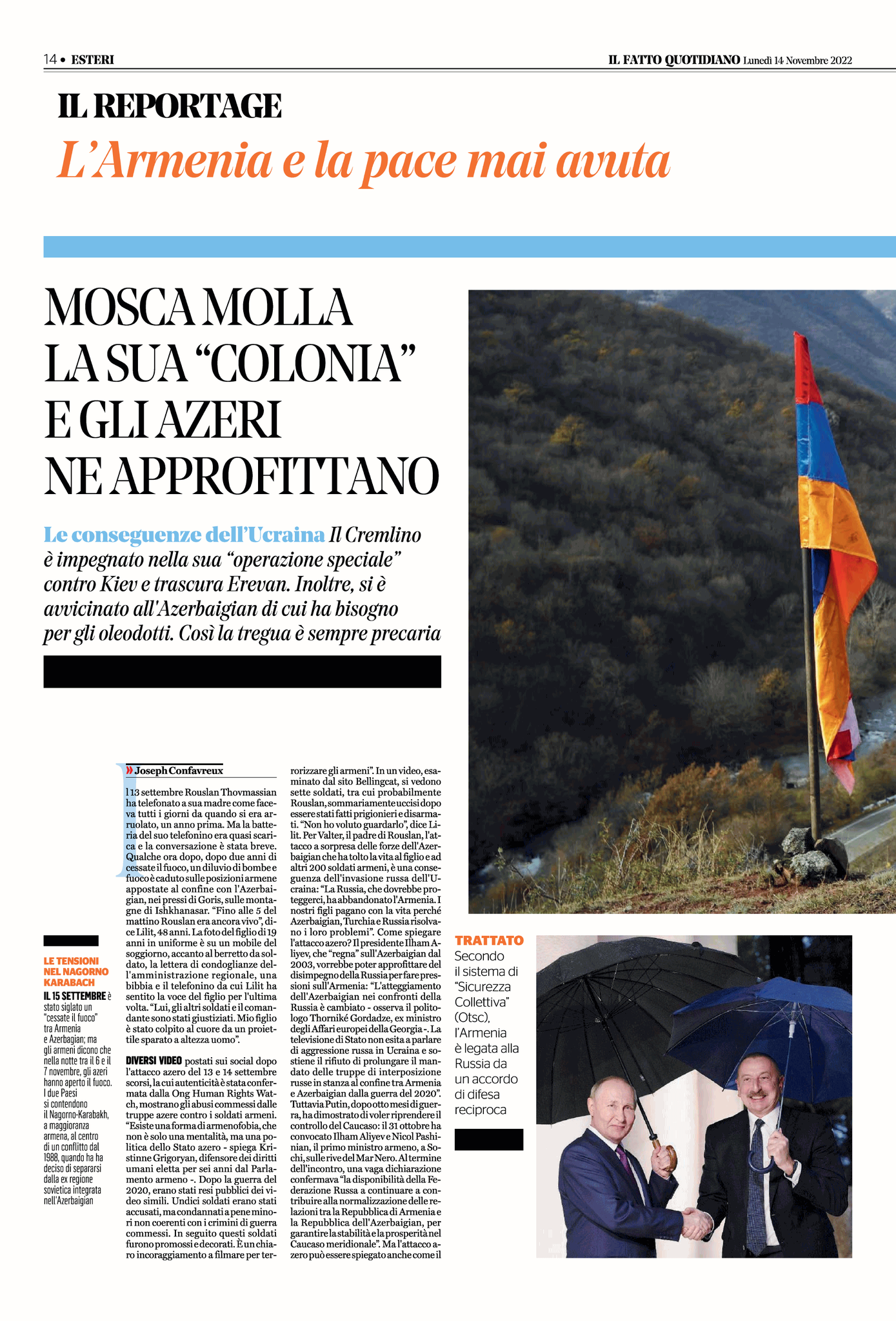 L’Armenia e la pace mai avuta (Il Fatto Quotidiano 14.11.22)