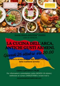 http://www.comunitaarmena.it/wp-content/uploads/2022/08/Logo_armenia-04-1-300x92.png00adminwphttp://www.comunitaarmena.it/wp-content/uploads/2022/08/Logo_armenia-04-1-300x92.pngadminwp2023-10-16 19:40:182023-10-24 18:07:19LIDO DI VENEZIA - 26 ottobre 2023 - La cucina dell'arca. Antichi gusti armeni