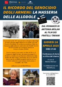 Giovedi 24 aprile 2025 alle ore 17:30 la Biblioteca Gino Baratta ospitera’ la conferenza di approfondimento 24 aprile 1915 â 24 aprile 2025. Il ricordo del genocidio degli Armeni: La masseria delle allodole a cura di Matteo Molinari, studioso di critica e storia del cinema in collaborazione con Associazione BibliOfficina.