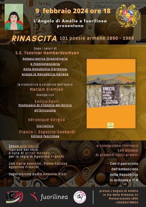 MONTEROTONDO – 09 febbraio 2024 – presentazione del libro “Rinascita. 101 poesie armene 1890-1989” 30 Gennaio 2024/in Appuntamenti /da adminwp http://www.comunitaarmena.it/wp-content/uploads/2022/08/Logo_armenia-04-1-300x92.png 0 0 adminwp http://www.comunitaarmena.it/wp-content/uploads/2022/08/Logo_armenia-04-1-300x92.png adminwp2024-01-30 17:30:262024-02-06 19:41:38MONTEROTONDO - 09 febbraio 2024 - presentazione del libro "Rinascita. 101 poesie armene 1890-1989"