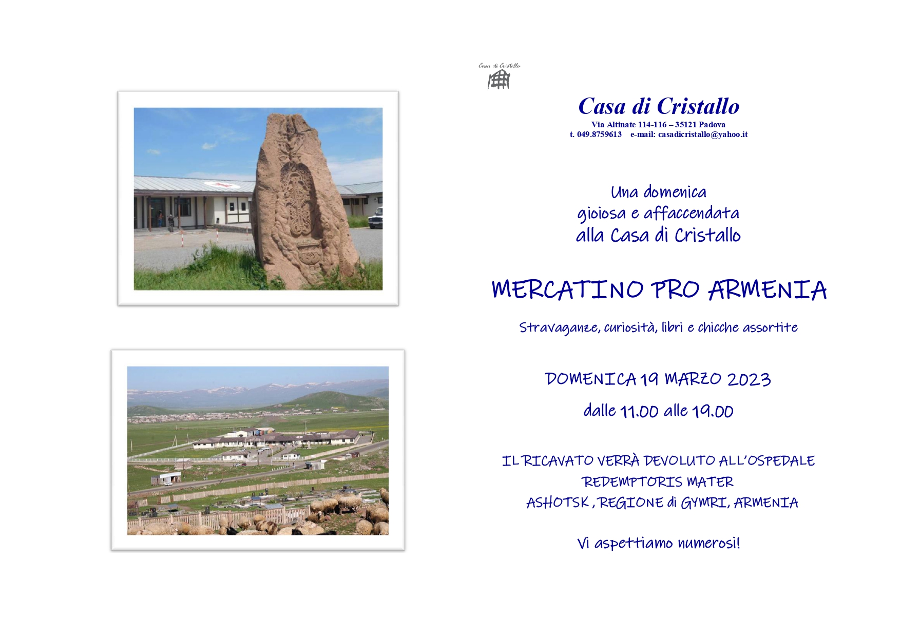PADOVA – 19 marzo 2023 – Mercatino pro Armenia 6 Marzo 2023/in Appuntamenti /da adminwp A Padova domenica 19 dalle h. 11.00 alle h. 19.00 Mercatino pro Armenia presso Casa di Cristallo, via Altinate, il ricavato sara’ devoluto all’ ospedale di Ashots, regione di Gyumri’. http://www.comunitaarmena.it/wp-content/uploads/2022/08/Logo_armenia-04-1-300x92.png 0 0 adminwp http://www.comunitaarmena.it/wp-content/uploads/2022/08/Logo_armenia-04-1-300x92.png adminwp2023-03-06 14:55:452023-03-14 18:06:25PADOVA - 19 marzo 2023 - Mercatino pro Armenia