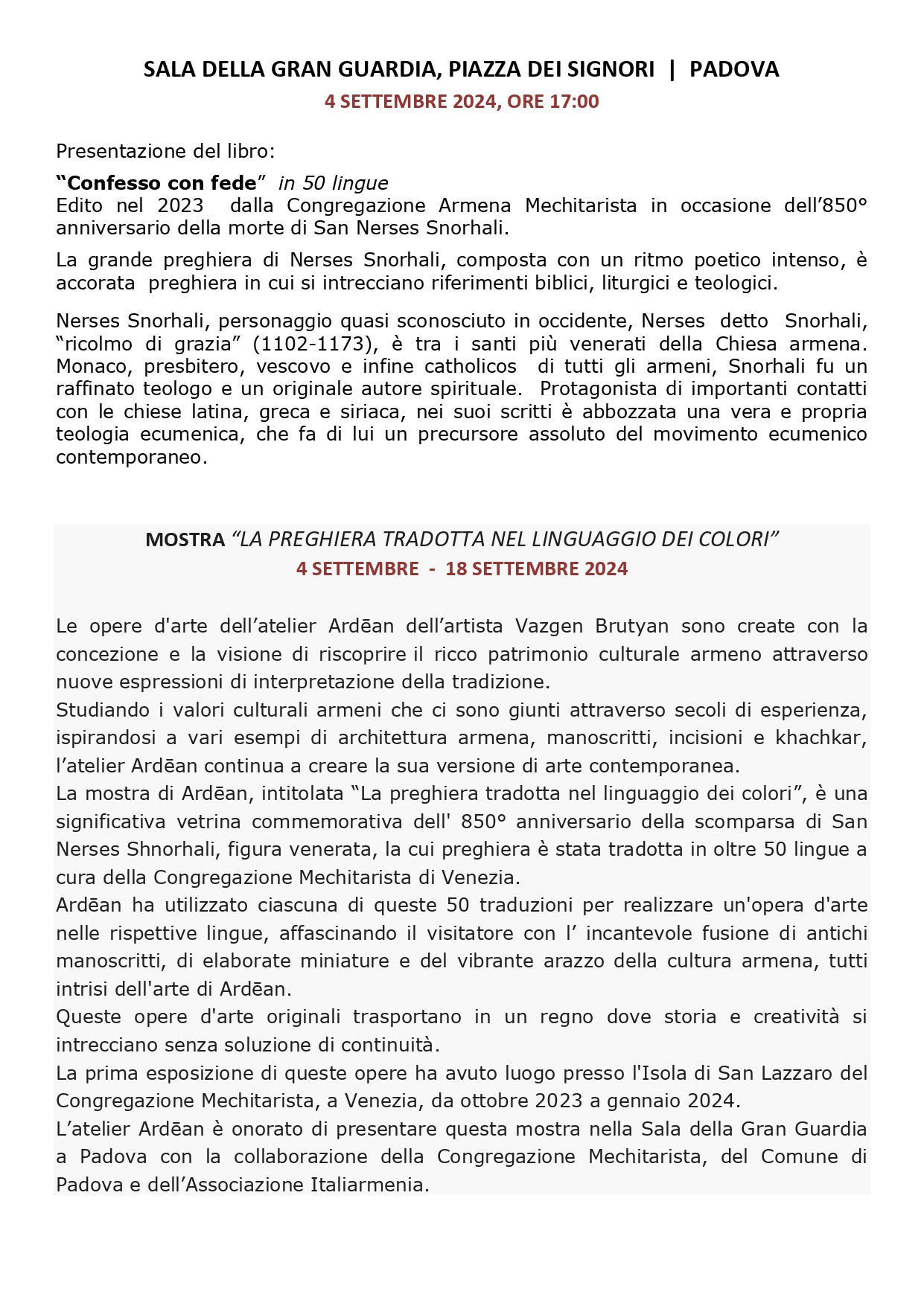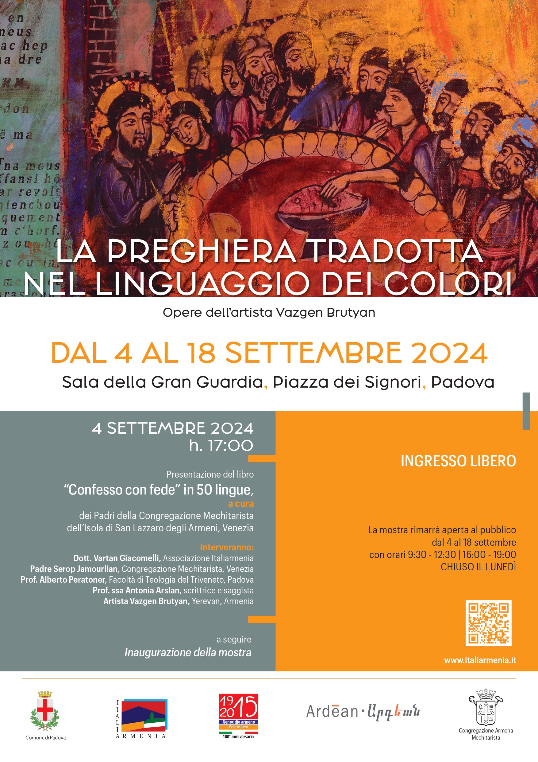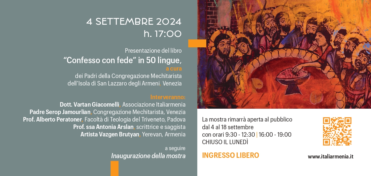ore 17:00: presentazione del libro “Confesso con fede” in 50 lingue, a cura dei Padri della Congregazione Mechitarista dell’Isola di San Lazzaro degli Armeni, Venezia.