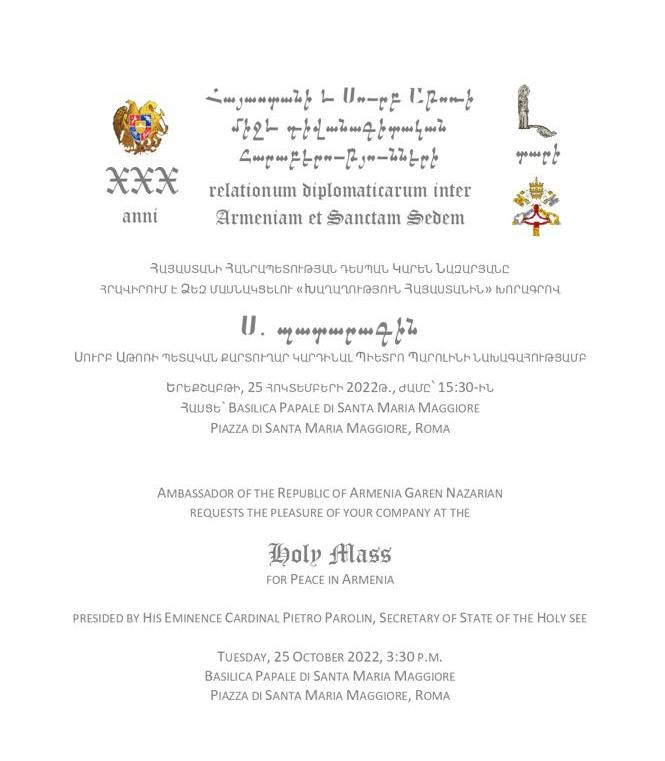 ROMA – 25 ottobre 2022 – 30° anniversario relaz. dipl. S. Sede-Armenia – Messa dedicata alla “Pace in Armenia”