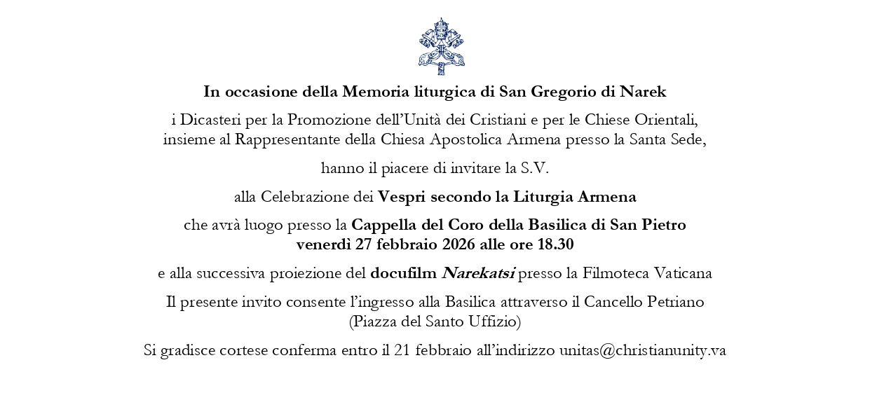 Si gradisce cortese conferma entro il 21 febbraio all’indirizzo unitas@christianunity.va