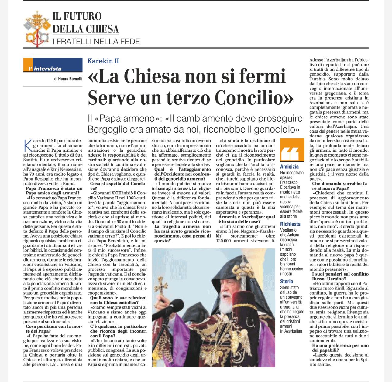 Il Vescovo della Chiesa Armena Aram I, è intervenuto alla trasmissione Quarta Repubblica dopo aver partecipato ai funerali di Papa Francesco insieme ad altri esponenti religiosi e politici di tutto il mondo per ricordare il pontefice scomparso che definisce: “Colui che ha aperto al popolo e trasformato le parole liturgiche in realtà quotidiana della gente“, e parlare delle nuove sfide da affrontare, anche individuando le priorità della realtà odierna, questioni che potrebbero essere alla base dell’elezione del nuovo Papa durante il Conclave.