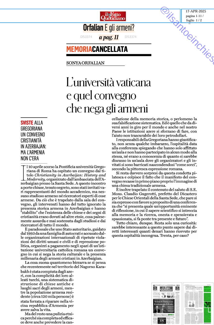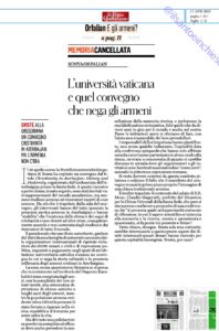 L’università vaticana e quel convegno che nega gli armeni (Ilfattoquotidiano 17.04.25)